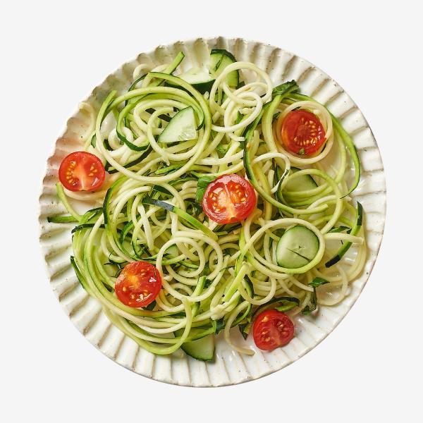 Спагетти могут быть полезными! Нежнейшие цукини, приготовленные на подушке из огурцов, дополнены сочными помидорами черри. В качестве заправки используется соус из кунжутного и оливкового масла с капелькой лимонного сока, базилика, соли и перца. Очень популярное и легкое блюдо.