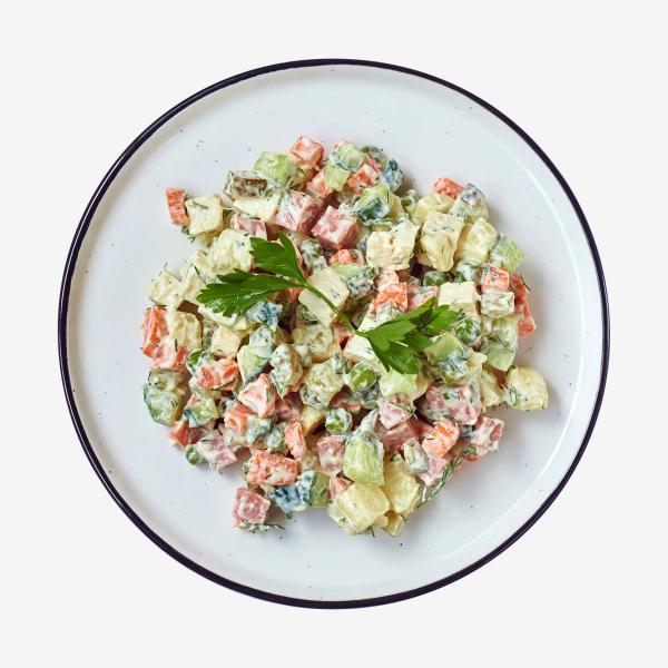 VEGAN Оливье — веганский вариант традиционного салата праздничного стола. В основе – нежный и мягкий тофу-гриль, который прекрасно сочетается с натуральными растительными продуктами. В качестве заправки — легкий соус из соевого майонеза. Блюдо богато антиоксидантами и витаминами.