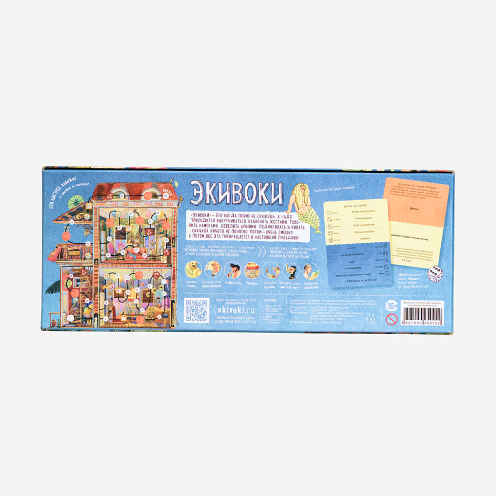 «ЭКИВОКИ» - настольная игра для компании от двух до шестнадцати человек, в которой нужно объяснять друг другу слова семью самыми разными способами. начале игры перед участниками раскладывается игровое поле, представляющее собой двухэтажный дом с чердаком, куда и нужно попасть командам.