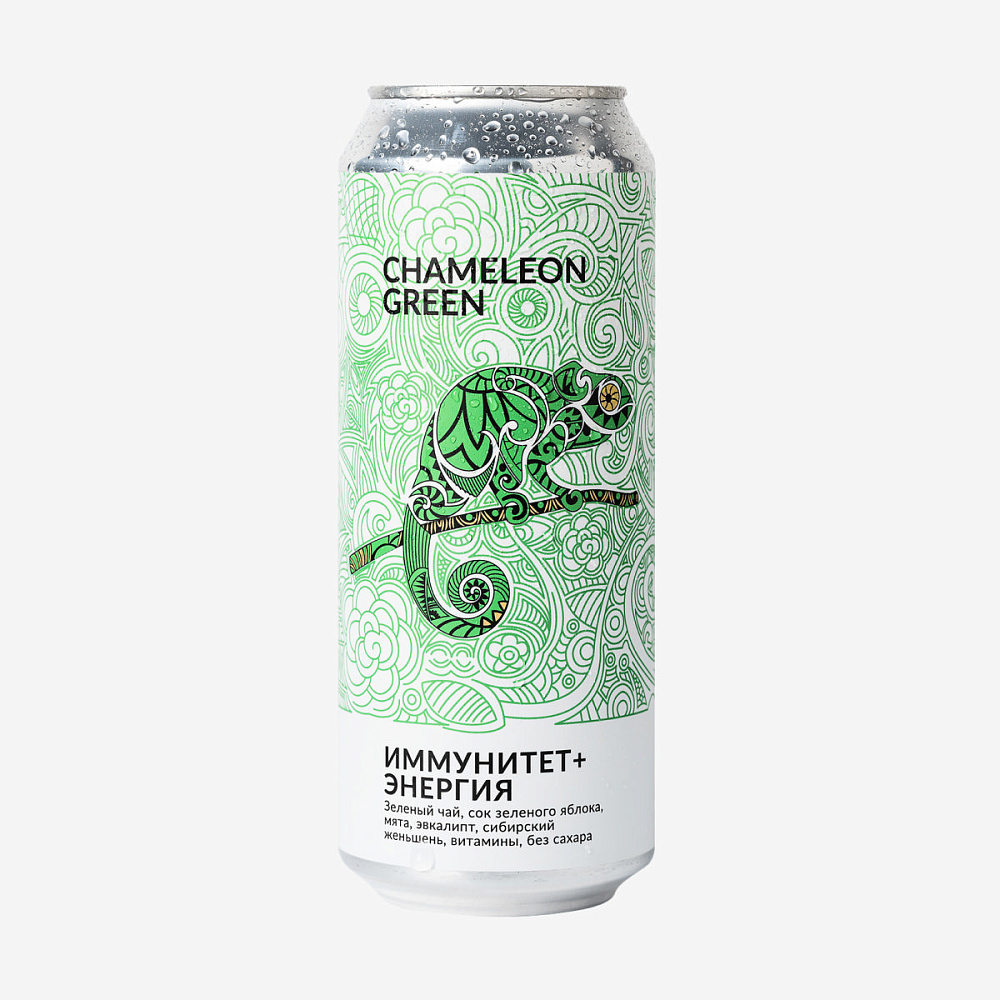 Многослойный вкус, тонкое послевкусие. Green Chameleon стимулирует энергию, иммунитет и здоровье за счет функционального компонента сибирский женьшень (элеутерококк). Придает естественную бодрость. Эффективно увлажняет. Слабо газированный напиток имеет натуральный состав на основе холодного чая и сока, без сахара.