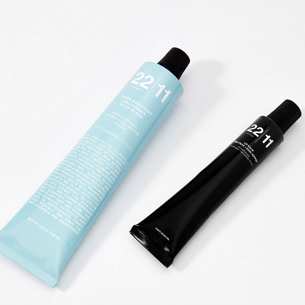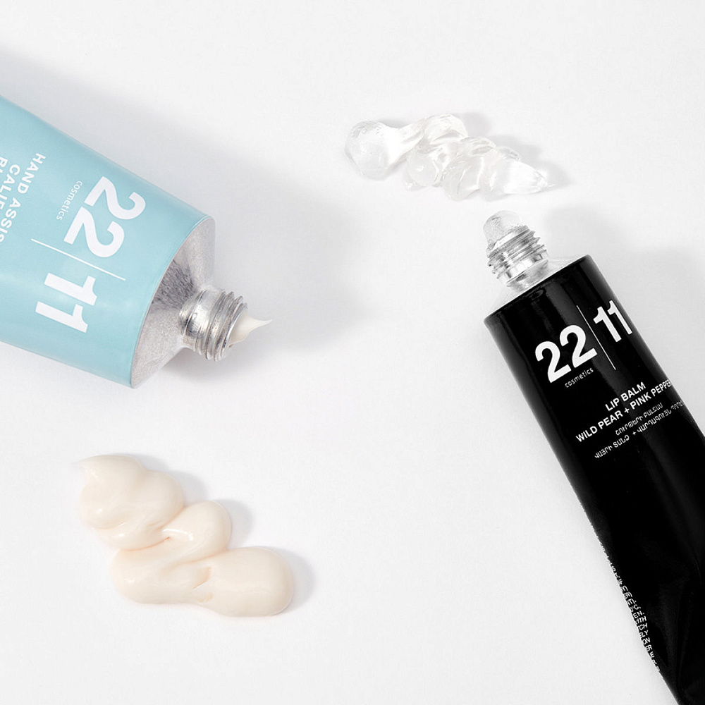 Набор 22|11 в минималистичной белой упаковке станет отличным подарком для тех, кто ценит натуральность в уходе за собой. В набор входит питательный бальзам для губ с нежным ароматом груши и экстрактом розового перца и крем для рук с экстрактом синей калифорнийской водоросли.
